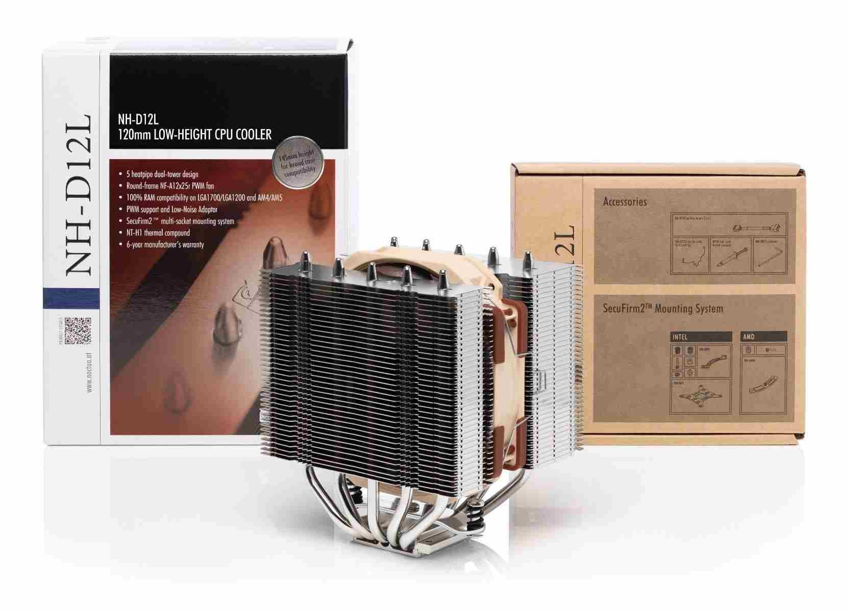 Nízky 120mm chladič CPU Noctua NH-D12L kombinuje mimoriadne efektívne chladenie s neobvykle širokou kompatibilitou aj s menšími PC skrinkami - teraz už nepotrebujete obrovské skrine, aby ste ochladili aj tie najvýkonnejšie stroje. Aj napriek menšej konštrukcii dokáže NH-D12L chladiť efektívnejšie ako aj popredné 120mm chladiče, ako je napríklad známy model NH-U12S. Pri montáži jedného ventilátora je vďaka asymetrickej konštrukcii 100% kompatibilný s RAM aj u patic AMD AM4/AM5 a Intel LGA1200/LGA1700. Perfektná voľba pre tých, ktorí potrebujú špičkový výkon, ale nemajú dostatok priestoru na väčší chladič Noctua NH-U12A.