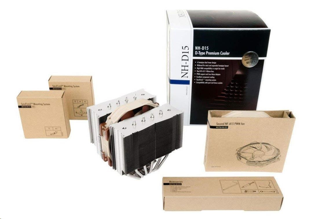Postavený na základe legendárneho NH-D14 a pokračujúc vo svojej snahe o dokonalý tichý výkon chladenia, flagship model NH-D15 od spoločnosti Noctua je vrcholný dvojitý vežový chladič pre najnáročnejších používateľov. Rozšírené usporiadanie heatpipe a dva prémiové ventilátory NF-A15 140mm s podporou PWM pre automatickú reguláciu rýchlosti mu umožňujú ešte vylepšiť ocenenú účinnosť NH-D14. Vrchom je spoľahlivý, profesionálny SecuFirm2™ viacpórový montážny systém, osvedčená tepelná pasta NT-H1 od Noctua a kompletná 6-ročná záruka výrobcu, čím NH-D15 predstavuje kompletné riešenie najvyššej kvality, ktoré je ideálne pre overclocking a tichých nadšencov.