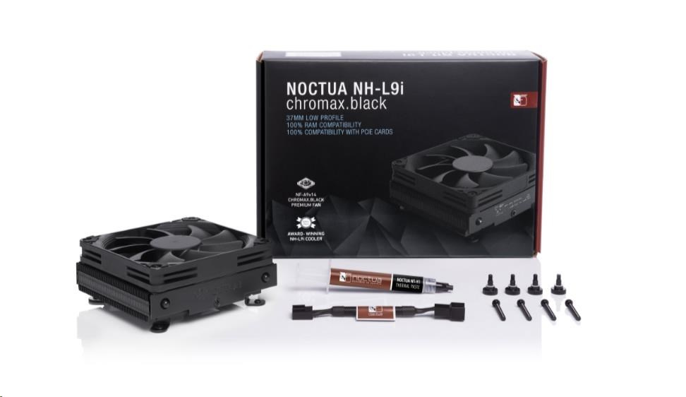 NH-L9i chromax.black je celokovová čierna verzia cenami ovenčeného nízkoprofilového chladiča NH-L9i pre HTPC a SFF systémy. Vďaka overenému dizajnu heatsinku a NF-A9x14 PWM ventilátoru ostáva verný úspešnej štruktúre klasického NH-L9i, ktorá kombinuje minimálnu priestorovú náročnosť (výška iba 37 mm) so silným výkonom, úžasnou tichosťou prevádzky a 100% kompatibilitou s RAM a PCIe. To všetko v elegantnom čiernom dizajne. Tento dokonalý výrobok uzatvára známy SecuFirm2™ multi-socket systém, teplovodivá pasta NT-H1 od Noctuy a plná záruka. NH-L9i chromax.black je tak samozrejmou voľbou, ak hľadáte kompaktný heatsink, ktorý vyzerá tak skvelo, ako chladí.