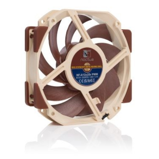 NF-A12x25r je verzia s okrúhlym rámom oceňovaného modelu 120mm ventilátora Noctua NF-A12x25. Vďaka svojmu okrúhlemu tvaru je ideálny na použitie na dvojradových chladičoch CPU s nízkou výškou, ako je NH-D12L, a tiež na iných priestorovo obmedzených aplikáciách, ktoré nemôžu pojmúť 120mm ventilátory s štvorcovým rámom. Rovnako ako štvorcový NF-A12x25, okrúhly NF-A12x25r využíva rekordne tesnú vôľu špičky iba 0,5 mm, čo je možné vďaka použitiu novej zmesi tekutých krištáľov (LCP) Sterrox®. NF-A12x25r, ktorý zdieľa ten istý najmodernejší dizajn obežného kola s kanálmi na zrychlenie prietoku, dosahuje rovnaký najlepší tichý chladicí výkon vo svojej triede ako jeho súrodenec s štvorcovým rámom. Podporuje tiež plne automatickú reguláciu rýchlosti pomocou PWM hlavičky ventilátora a je dodávaný s nízkohlučným adaptérom na zníženie maximálnej rýchlosti z 2000 na 1700 ot./min. NF-A12x25r, doplnený výnimočne hladkým chodom, ložiskom SSO2 referenčnej triedy Noctua, bohatým balíkom príslušenstva a 6-ročnou zárukou výrobcu, je skrz naskrz produktom prémiovej kvality. Jeho vynikajúca účinnosť, špičková konštrukcia a priekopnícke materiály z neho robia elitnú voľbu pre všetky 120mm aplikácie, ktoré vyžadujú okrúhly rám.