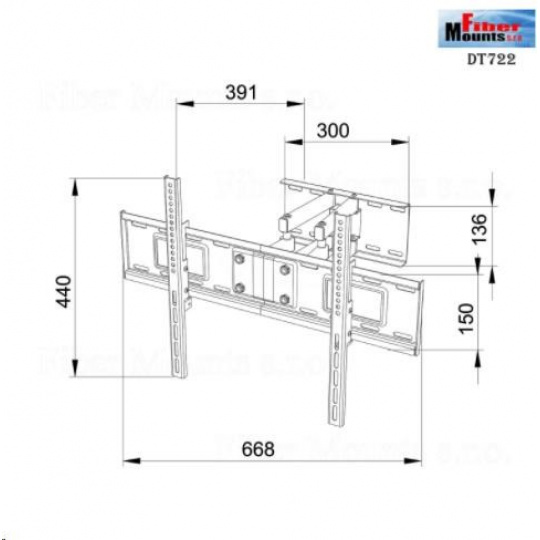 Technické údaje: maximálne zaťaženie 45kg podporuje VESA štandardy 75x75 až 600x400 odporúčame na televízory s uhlopriečkou 37 až 70" vhodný na všetky typy a značky televízorov s podporou VESA nastaviteľná vzdialenosť od steny minimálna vzdialenosť 70mm maximálna vzdialenosť 460mm otáčanie do strán +/- 75° náklon nahor alebo nadol +10° až -20° možná úprava roviny obrazovky po montáži veľmi pevná a robustná konštrukcia bezpečné upevnenie televízora, zabezpečenie proti vysadeniu materiál oceľ inštalačný materiál farebné prevedenie čierne záruka 3 roky Otočný držiak LCD Fiber Mounts DT723 podporuje uchytenie TV štandardy VESA: VESA 75x75 VESA 100x100 VESA 200x100 a 100x200 VESA 200x200 VESA 300x100 a 100x300 VESA 300x200 a 200x300 VESA 300x300 VESA 400x100 a 100x400 VESA 400x200 a 200x400 VESA 400x300 a 300x400 VESA 400x400 VESA 600x400