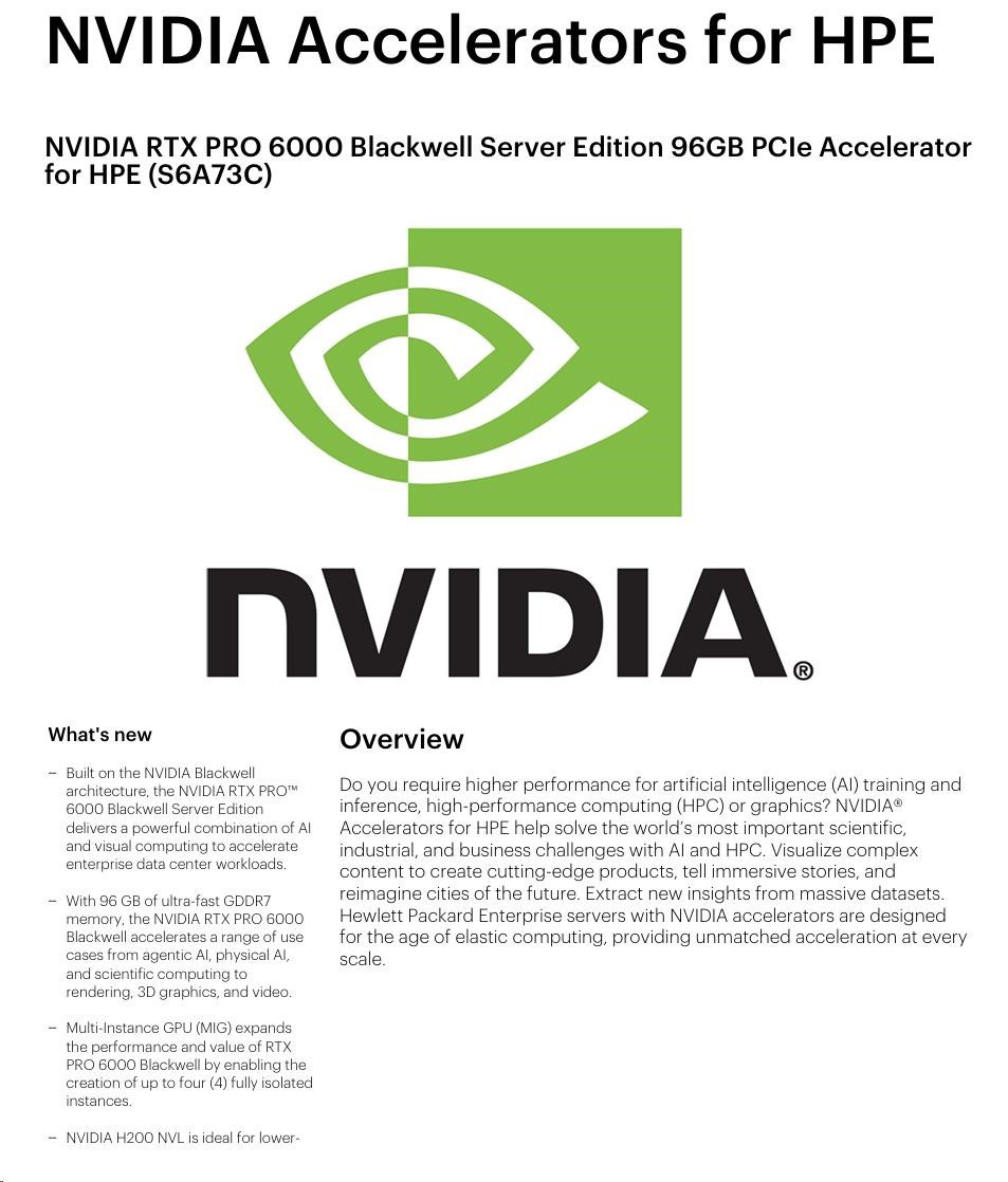 NVIDIA RTX PRO 6000 Blackwell Server Edition 96GB PCIe Accelerator for HPE.