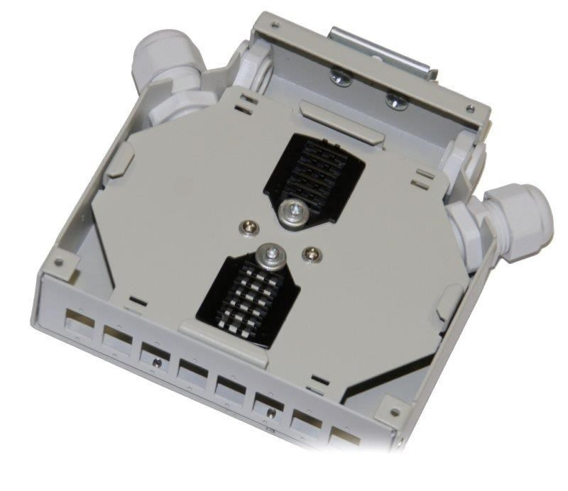 Box z optických vlákien na DIN lištu 8x SC simplex (8x LC duplex) so 16 spojovacími hrebeňmi
