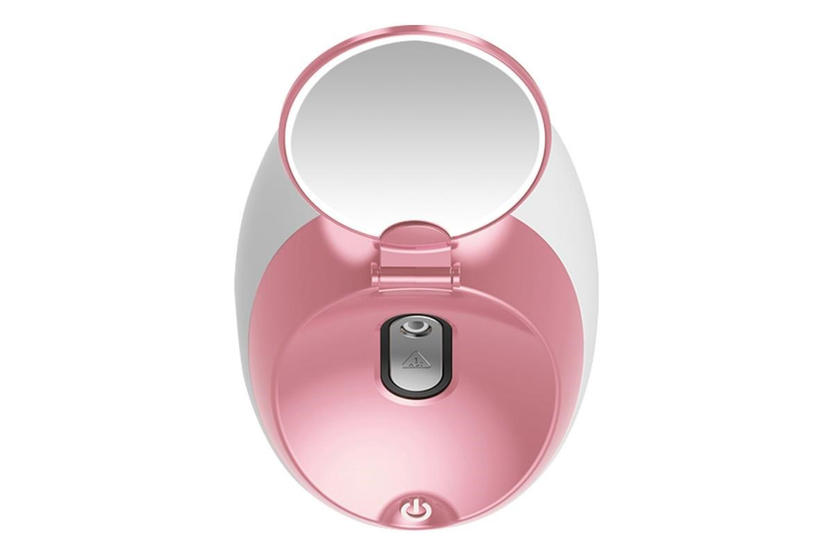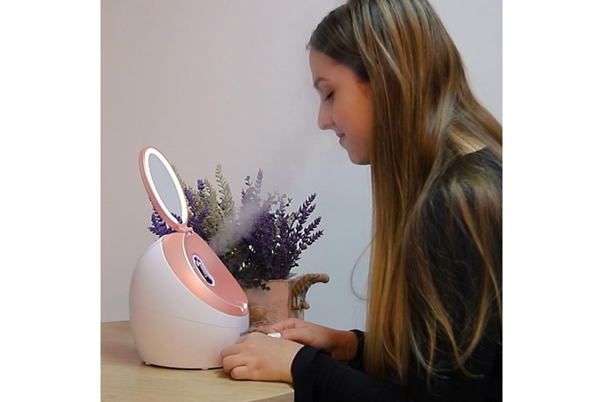 Do 80 ml nádržky načerpáte vodu, zapojíte ju do elektrickej zásuvky, zapnete - a domáce wellness pre pleť práve začalo. Sauna vytvára vodnú paru s teplotou 40 °C. Pokožku hlboko masíruje a hydratuje ju, otvára póry pre efektívnejšie čistenie a pripraví pleť na prijímanie živín a blahodarných esencií z výživných krémov a masiek a kúier, ktoré si po inhalácii a vyčistení pleti nanesiete na tvár a dekolt.Kozmetické zrkadlo