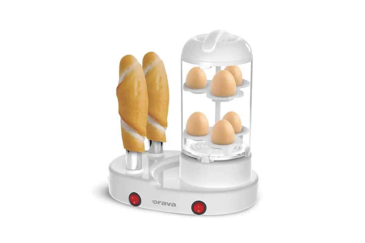 Tradičné raňajkové kombó? Klobásky a chutné vajíčka natvrdo si teraz pripravíte v jednom zariadení. Stroj na prípravu hotdogov Orava HM-04 s dvoma nástrčnými trny a varnou nádobou z nerezu dokáže v daždi pripraviť až 6 klobások a s použitím špeciálneho nástavca aj 6 vajíčok natvrdo.