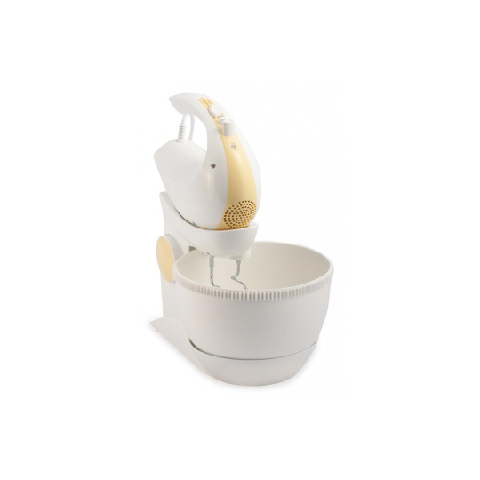 Elektrický ručný šľahač s otočnou nádobou, 5 rýchlostí a funkciou TURBO pre maximálny výkon, 2,5 l otočná nádoba s mechanickým pohonom, Sada šľahacích metiel a metiel na hnetenie, Výklopné rameno, Napájanie: 230V~ 50Hz,  300 W