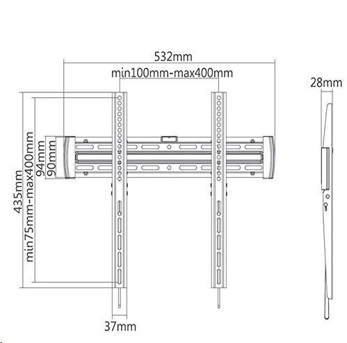 Technické údaje: max. zaťaženie 30kg podporuje VESA štandardy 75x75 až 400x400 odporúčame na televízory s uhlopriečkou 32-55" posunutie TV od steny 28mm automatické zabezpečenie TV proti vysadeniu uvoľnenie pomocou pák, ktoré zostanú skryté za obrazovkou bezpečný držiak, pevná konštrukcia integrovaná vodováha pre jednoduchú montáž dodávame vrátane montážneho materiálu farba čierna záruka 2 roky Držiak Fiber Mounts MC643 podporuje VESA štandardy: VESA 75x75 VESA 100x100 VESA 200x100 VESA 200x200 VESA 300x200 VESA 300x300 VESA 400x200 VESA 400x300 VESA 400x400