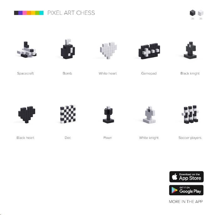 Súprava PIXIO 70101 Chess (Šachy) obsahuje šachovnicu na šach a iné hry s použitím dvojfarebnej hracej dosky 8x8 a celkovo 70 čiernobielych kociek, z ktorých môžete stavať nielen šachové figúrky a hrať hru, ale aj mnoho ďalších modelov. Umožnia oživiť vaše kreatívne nápady a prinesú farebnú radosť do života. Začnite stavbou jednoduchých modelov podľa pokynov a potom, až budete pripravení, prejdite k vytváraniu vlastných návrhov. S touto sadou si môžete postaviť šachové figúrky, raketoplán, gamepad, cieľovú vlajku, bombu, biele alebo čierne srdce a mnoho ďalších. Pixio je splnený sen fanúšikov Pixel Artu, hráčov Minecraftu a všetkých, ktorí sa radi hrajú. Použite ho ako učebný zdroj na rozvoj detskej kreativity. Obsahuje 35 čiernych a 35 bielych kociek a šachovnicu. Použite kocky podľa svojej fantázie a vytvorte krásne tvary a modely.