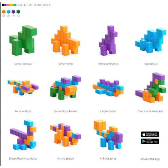 Séria PIXIO Mini Dinos obsahuje 80 blokov PIXIO v 4 farbách. Oživte svoje kreatívne nápady a
