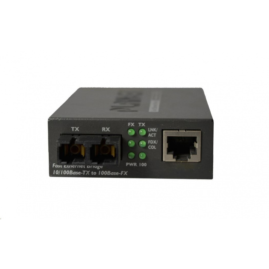 Prepínač Fast Ethernet 10/100Base-TX - 100Base -FX (SC), single mode, pripojenie do 15 km. Plný duplex, 1k MAC adries, malé rozmery. (26x70x110mm), mostík.