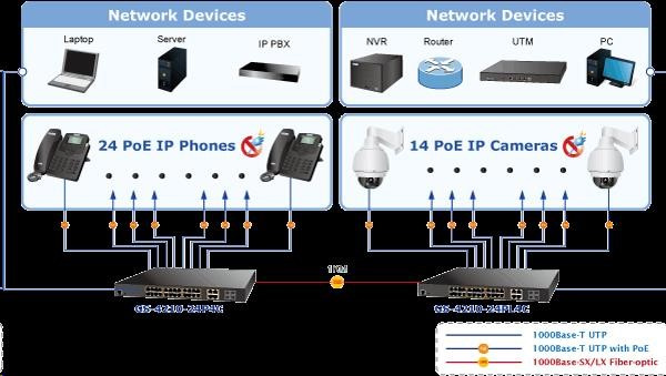 Gigabitový spravovateľný prepínač s portami PoE (napájanie cez ethernet) na centralizované napájanie zariadení cez ethernet, ako sú IP kamery, prvky WiFi alebo telefóny VOIP. Zariadenie je vhodné na inštaláciu do kancelárskych alebo prezentačných priestorov. Je vhodný aj pre aplikácie v miestnych rozvádzačoch, pripojenie je možné realizovať pomocou optických portov SFP. Bezpečnú správu zabezpečuje šifrovaná webová správa alebo protokol SNMPv3. Pripojenia koncových používateľov môžu byť zabezpečené pravidlami ACL/MAC alebo možnou autorizáciou na serveri RADIUS/TACACS. Vlastnosti: - 28 portov 1000Base-T, prepínanie, plný duplex (1000/2000 Mb/s), automatické vyjednávanie (10/100/1000 Mb/s) - 24x zabudované injektory PoE 802.3at, každý injektor do 30 W/port; celkový max. napájanie až 440 W - 4x SFP zdieľané s metalickým (25-28), 100/1000Base-X, pre inštaláciu optických modulov mini-GBIC s označením MFB a MGB - Auto-MDI/MDI-X, automatická detekcia priameho kríženia kábla aj pre 10/100 Mbps - ESD ochrana na všetkých portoch do 2kV DC - 8k MAC adries, 4,1MB buffer - priepustnosť: 52Gbps zbernica, 42Mp/s dáta (64B) - podpora prenosu Jumbo frame 10KB - správa: WEB / SNMPv3 / telnet / konzola; podpora SSL/SSH - podpora protokolov IPv4/IPv6 - VLAN IEEE 802.1Q, až 256 skupín, až 4094 VLAN ID; protokolové, VoIP a privátne VLAN - LACP agregácia portov 802.3ad, až 8 skupín po 8 portoch - QoS 8 front, klasifikácia podľa prevádzky, váženého priemeru alebo značky VLAN - Protokol Spanning tree: STP IEEE 802.1D / RSTP IEEE 802.1w / MSTP IEEE 802.1s - IGMPv3 snooping, Querier, až 256 multicastových skupín - zrkadlenie portov-port mirroring TX/RX/TX+RX/multiple na port - zabezpečenie klienta: zoznam riadenia prístupu (ACL), statická tabuľka MAC pre autorizované zariadenia, autorizácia RADIUS/TACACS+, DHCP snooping, pripojenie IP+MAC na port - ochrana proti útokom DoS - sústava indikátorov LED pre diagnostiku prevádzky - tepelná ochrana proti prehriatiu - rozmery: (440 x 300 x 44,5)mm, montáž 19"/1U - hmotnosť 4,8 kg - prevádzková teplota: 0-50 °C - interný zdroj striedavého prúdu 110-240V/50-60Hz, vlastná spotreba cca 30W..