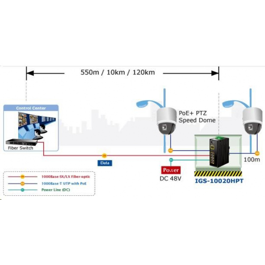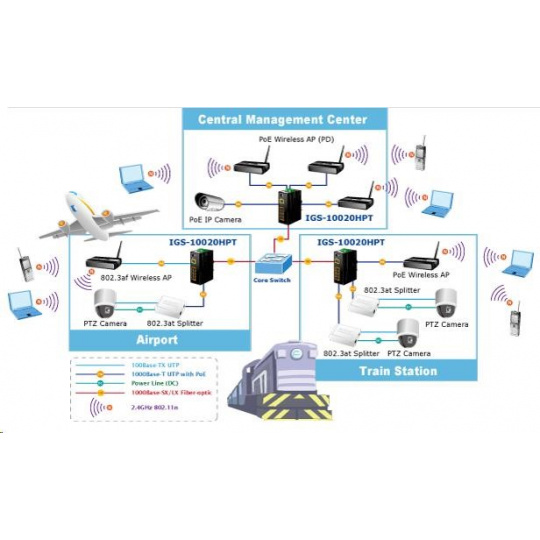 Planet IGS-10020HPT PoE switch 8x 1000Base-T, 2x SFP, 802.3at 270W, IP30, -40 až 75°C, SNMP, IGMPv3, IPv6 Inteligentné prepínače pre priemyselný Ethernet sú určené do náročných prevádzkových podmienok so širokým rozsahom prevádzkových teplôt, neistým napájaním a častými otrasmi. Zároveň poskytujú vynikajúce možnosti viacnásobného prepojenia na dosiahnutie robustného prepojenia systému s veľmi nízkym časom obnovy. IGS-10020HPT je vybavený pre redundanciu okrem známej metódy Spanning Tree (ktorej čas obnovy sa pohybuje v sekundách) najmä špecializovanou funkciou "Redundant ring", ktorá má čas obnovy a nájdenia novej cesty do 300 ms. Ako prepínač PoE môže priamo napájať až 8 zariadení IEEE 802.3at, a preto je ideálny pre aplikácie so zníženou dostupnosťou energie. Prepínače radu IGS sa ľahko inštalujú na štandardnú lištu DIN alebo priamo na stenu a umožňujú nasadenie známej technológie Ethernet aj v priemyselnom prostredí. Sú vhodné aj na inštaláciu vo vonkajších krytoch s veľkými výkyvmi prevádzkových teplôt (typicky bezdrôtové aplikácie a aplikácie MAN ISP). Vlastnosti: - 8 portov 1000Base-T, prepínanie, plný duplex (1000/2000 Mb/s), automatické vyjednávanie (10/100/1000 Mb/s), automatická detekcia priameho/krížového kábla na každom porte - pre všetky PoE IEEE 802.3at injektory so zaťažiteľnosťou 30 W/port, spolu až 270 W - 2 porty SFP na inštaláciu modulov 1000Base-SX/LX/BX alebo 100Base-FX - Priepustnosť: zbernica 20 Gb/s, 14,8 Mp/s (64B) - Podpora Jumbo Frame do 9 kB, 8k MAC adries, 4Mbitová vyrovnávacia pamäť - 255 VLAN IEEE 802.1Q, siete založené na MAC alebo protokole VLAN, VoIP VLAN - port trunking IEEE 802.3ad LACP - IGMP v1,v2,v3 až do 256 multicast skupín, režim IGMP querier - 8-úrovňová prioritizácia prevádzky QoS podľa portov, DSCP/ToS, 802.1p alebo 802.1Q tagy - podpora Spanning Tree IEEE 802.1d, Rapid Spanning Tree IEEE 802.1w - IP/MAC ACL (access control list) do 123 pravidel, MAC/IP binding - DHCP snooping - port shaper - administrace Web/SNMPv3 s podporou zabezpečeného přenosu SSH/SSL - podpora IPv4/IPv6 - PoE scheduler pro možnost zapínání/vypínaní napájení podle časového plánu - pole LED indikátorů pro diagnostiku provozu - instalace na DIN lištu, montážní díl součástí - instalace na zeď, montážní díl součástí - krytí IP30 - napájení: 48V DC redundantní, připojení možné ze dvou různých zdrojů (nejsou součástí balení); vlastní příkon do 30W - ochrana proti přepólování, připojení napájení na svorkovnici, umístění na spodním panelu (nepřekáží při montáži na zeď) - přepěťová ochrana napájení do 6kV proti napěťovým špičkám (EFT) - přepěťová ochrana LAN portů do 6kV proti elektrostatickému náboji (ESD) - spínací poplachové relé (24V/1A) při výpadku primárního napájení - zařízení je odolné proti pádu (IEC-60068-2-32) z výšky 7.