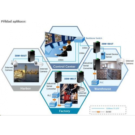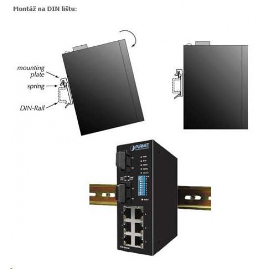 Planet ISW-501T, 5x 10/100, DIN, IP30, rozšírený teplotný rozsah -40 ~ 75 st.C Priemyselné ethernetové prepínače sú určené do náročných prevádzkových podmienok so širokým rozsahom prevádzkových teplôt, neistým napájaním a častými otrasmi. Prepínače radu ISW sa ľahko inštalujú na štandardnú lištu DIN alebo priamo na stenu a umožňujú nasadenie známej technológie Ethernet aj v priemyselnom prostredí. Sú vhodné aj na inštaláciu vo vonkajších krytoch s veľkými výkyvmi prevádzkových teplôt (typicky bezdrôtové aplikácie a aplikácie MAN ISP). Vlastnosti: 5 portů 100 Base-TX, Switching, Full Duplex (100/200 Mbps), Auto-Negotiation (10/100 Mbps) 2k MAC adres automatická detekce přímý/křížený kabel na každém portu pole LED indikátorů pro diagnostiku provozu instalace na DIN lištu, montážní díl součástí instalace na zeď, montážní díl součástí krytí IP30, skříň celohliníková napájení: 12-48V DC redundantní, připojení možné ze dvou různých zdrojů (nejsou součástí balení) ochrana proti přepólování, připojení napájení na svorkovnici, umístění na spodním panelu (nepřekáží při montáži na zeď) zařízení je odolné proti pádu (IEC-60068-2-32) z výšky 75cm na všechny dopadové části zařízení je odolné proti vibracím (IEC-60068-2-6) 10-500-10Hz, 4x g, 0,5oct/min zařízení je odolné proti přetížení krátkodobému zrychlení 50x g, dlouhodobému 4x g (IEC-60068-2-27) EMI/EMS, elektromagnetická kompatibilita a slučitelnost dle CE EN-6100-4-2,3,4,5,6 elektrická bezpečnost d C, vlhkosť do 90 % výkon 11 W hmotnosť: 438 g rozmery: 135 x 87 x 32 mm..