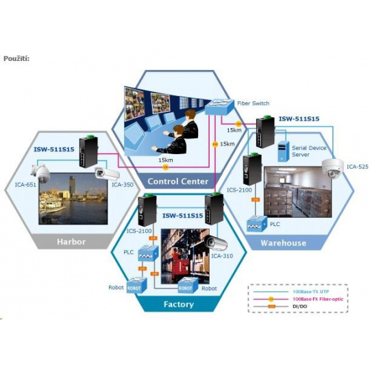 Planet ISW-511, 4x 10/100Base-TX+ 1x 100FX 2km, MM, DIN, IP30 Priemyselné ethernetové prepínače sú určené do náročných prevádzkových podmienok so širokým rozsahom prevádzkových teplôt, neistým napájaním a častými otrasmi. Prepínače radu ISW sa ľahko inštalujú na štandardnú lištu DIN alebo priamo na stenu a umožňujú nasadenie známej technológie Ethernet aj v priemyselnom prostredí. Sú vhodné aj na inštaláciu vo vonkajších krytoch s veľkými výkyvmi prevádzkových teplôt (typicky bezdrôtové aplikácie a aplikácie MAN ISP). Vlastnosti: - 4 porty 100Base-TX, prepínanie, plný duplex (100/200 Mb/s), automatické vyjednávanie (10/100 Mb/s), automatická detekcia priameho/krosového kábla na každom porte - 1 port 100Base-FX, plný duplex, konektory SC, multimodemový, pre vlákna 50/125um a 62,5/125um, dosah 2 km, vlnová dĺžka 1300 nm, zdvih min. 15,5 dB (vysielací výkon max. -14dBm, min. -19dBm, citlivosť príjmu -34,5dBm) - 1M vyrovnávacia pamäť, priepustnosť zbernice 1Gbps - sústava LED indikátorov pre diagnostiku prevádzky - montáž na DIN lištu, montážny diel je súčasťou dodávky - montáž na stenu, montážny diel je súčasťou dodávky - krytie IP30, celohliníkový kryt - napájanie: 12-48V DC redundantné, možnosť pripojenia z dvoch rôznych napájacích zdrojov (nie sú súčasťou dodávky) - ochrana proti prepólovaniu, pripojenie napájania na svorkovnicu, umiestnenie na spodnom paneli (neprekáža pri montáži na stenu) - prioritizácia prevádzky QoS podľa portov, ToS, 802.1p - zariadenie je odolné voči pádu (IEC-60068-2-32) z výšky 75 cm na všetky nárazové časti - zariadenie je odolné voči vibráciám (IEC-60068-2-6) 10-500-10Hz, 4x g, 0,5okt/min - zariadenie je odolné voči preťaženiu krátkodobé zrýchlenie 50g, dlhodobé 4g, (IEC-60068-2-27) - EMI/EMS, elektromagnetická kompatibilita a kompatibilita podľa CE EN-6100-4-2,3,4,5,6 - elektrická bezpečnosť podľa CE EN-60950 - prevádzková teplota -10 až 60 st. C, vlhkosť do 95 % - teplota skladovania -40 až 85 st. C - spotreba energie 9,1 W - rozmery 135 x 97 x 32 mm..