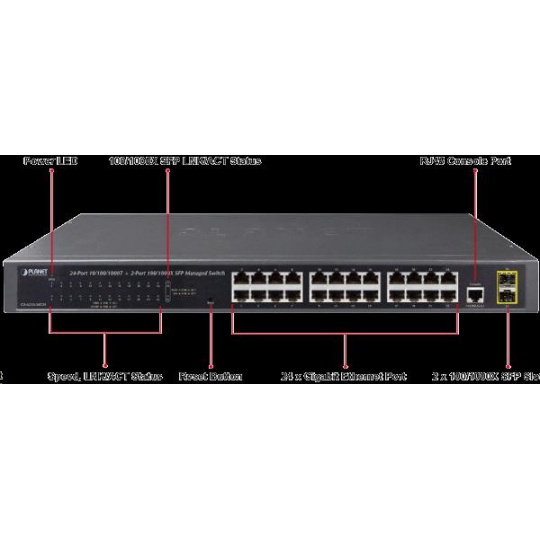 Gigabitový spravovateľný prepínač na inštaláciu v náročnejších lokálnych sieťach má širokú škálu funkcií na zabezpečenie prevádzky bezpečnej siete elimináciou možných útokov na nižších vrstvách modelu OSI a možnej autentifikácie koncových zariadení. Pripojenia koncových používateľov môžu byť zabezpečené pravidlami ACL/MAC alebo možnou autorizáciou na serveri RADIUS/TACACS. Bezpečnú správu zabezpečuje šifrovaná webová správa alebo protokol SNMPv3 prostredníctvom protokolu IPv4 alebo nového protokolu IPv6. náhrada za GSW-2404SF - 24 portov 1000Base-T, prepínanie, plný duplex (1000/2000 Mb/s), automatické vyjednávanie (10/100/1000 Mb/s) - 2x SFP, 100/1000Base-X, na inštaláciu optických modulov mini-GBIC s označením MFB a MGB - Auto-MDI/MDI-X, automatická detekcia priameho kríženého kábla aj pre 10/100 Mb/s - 8k MAC adries, 4,1MB vyrovnávacia pamäť - Priepustnosť: 52Gb/s zbernica, rýchlosť prenosu dát 38,6Mp/s (64B) - podpora prenosu Jumbo rámcov 9KB - Správa: WEB / SNMPv3 / telnet / konzola(COM port); plná podpora protokolov IPv4/IPv6 - VLAN IEEE 802.1Q, až 256 skupín, až 4094 VLAN ID, protokolové VLAN, VoIP-VLAN - LACP agregácia portov podľa IEEE 802.3ad, až 8 skupín po 8 portoch - QoS 8 úrovní pre 8 frontov; klasifikácia podľa prevádzky, váženého priemeru alebo IEEE 802.1p a DSCP - Port shaper: obmedzenie rýchlosti prenosu dát - Spanning tree protokol IEEE 802.1D: STP / RSTP / MSTP - IGMPv3 Snooping, Querier, až 256 multicast skupin - podpora LLDP protokolu - zrcadlení portů-port mirroring: TX / RX / TX+RX - zabezpečení klientů: ACL (access control list), MAC statická tabulka pro autentizovaná zařízení, podpora ověření vůči serverům RADIUS/TACACS+, DHCP snooping - ochrana DoS proti útokům v síti, StormControl proti eliminaci chybných provozů - pole LED indikátorů pro diagnostiku provozu - ESD ochrany proti statické elektřině - rozměry: (445 x 207 x 45)mm, hmotnost 2,1kg - provedení rackmount 19"/1U - provozní teplota: 0-50°C - interní napájecí zdroj AC 110-240V/50-60Hz, vlastní příkon do 14W - fanless: žádný ventilátor..