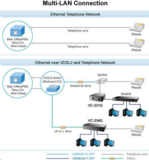 PLANET VC-231G Ethernet cez telefónnu linku (technológia VDSL2). 1x LAN RJ-45, 1x VDSL2 RJ-11. Priehľadný most. G.993.2 VDSL2, G.993.5 G.Vektorovanie + G.INP. Kapacita 200/160 Mb/s na 200 m. Dosah až 1,4 km. Nastavenie prepínača DIP, voliteľne Master (CO) / Slave (CPE). Možná prevádzka na linke VDSL O2. Ethernetový konvertor LRE (Long Reach Ethernet) na VDSL2 (Very-high-data-rate Digital Subscriber Line 2) umožňuje prenášať dáta po symetrickom páre vodičov rýchlosťou až 200 Mbit/s na vzdialenosť 200 m alebo 30 Mbit/s na vzdialenosť až 1,4 km, pričom prenosové rýchlosti závisia od stavu a kvality použitej linky. Zariadenie je univerzálne ako jednotka master (CO) / slave (CPE), režim sa nastavuje prepínačom. Jednotka podporuje prevádzkové režimy VDSL2 podľa prenosových profilov "17a" a "30a", "pásmo Plan997" a G.993.5 G.Vektorovanie a G.INP ovplyvňuje symetrický prenos dát pri vyšších rýchlostiach aj na paralelných linkách. Pomocou externého rozdeľovača je možné zachovať hlasovú službu na telefónnej linke bez ďalších úprav kabeláže. Takto je možné využívať telefónne káblové vedenia pôvodne určené na pripojenie nielen k účastníkom, ale aj medzi analógovými ústredňami. Poskytovatelia internetových služieb (ISP) môžu ponúkať multimediálne služby, VOD (video na požiadanie), VoIP (voice over IP), videotelefón, IPTV atď. Aplikácia VDSL2 s pokročilým G.INP a G.Vektorovanie možno prevádzkovať aj v rámci aktívnych prvkov prostredníctvom rozhraní SFP vďaka modulu XL-MGB-VDSL2-R2 (pozri. odporúčané príslušenstvo). Modem možno úspešne prevádzkovať cez linky VDSL spoločnosti O2. ZÁKLADNÉ ŠPECIFIKÁCIE Porty: 1 x 10/1000Base-T, RJ-45 1 x VDSL, RJ-11 Podpora prenosu: JumboFrame 2K MAC adries IEEE 802.3, IEEE 802.3u, IEEE 802.3ab, IEEE 802.3x, IEEE 802.3p Transparent pre IEEE 802.1Q VLAN tag Štandard: ITU-T: G.993.1 - VDSL, G.997.1, G.993.2 - VDSL2 (profily 17a/30a), G.993.5 G. - Vektorovanie a G.INP, G.998 Prepínanie DIP: výber CPE/CO, výber modulácie, výber komunikačného limitu, výber SNR Napájanie: z externého adaptéra, 5V/2A Prevádzková teplota: 0 až 50 °C, vlhkosť <90 % Rozmery: 97 x 70 x 26 mm Hmotnosť: 184 g Možno inštalovať do šasi MC-700, MC-1500, MC-1500R Príklad rozsahov a rýchlostí (down/up Mb/s) na linkách s vodičmi AWG24 a lepšími: 200 m -> 225.34Mb/122.39Mb 400m -> 151.89Mb/78.78Mb 600m -> 90.42Mb/49.93Mb 800m -> 57.70Mb/29.87Mb 1000m -> 45.33Mb/9.21Mb 1400m -> 34.74Mb/5.75Mb Nastavenie modemu pre pripojenie O2 VDSL v režime CPE; ďalšie prepínače DIP Prenos, Pásmo, SNR podľa kvality spojenia v routeri na rozhraní WAN použite VLAN ID:848 cez WAN nastavte PPPoE klienta, Prihlásenie: O2/O2 venujte pozornosť aj nastaveniam vášho routera, jeho firewallu, prístupovým právam, UPnP atď...