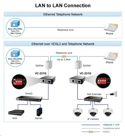 Planet VC-231G, Eth. VDSL2 konvertor, 1000Base-T, master/slave, profil 30a, G.993.5 Vectoring, G.INP, RJ-11