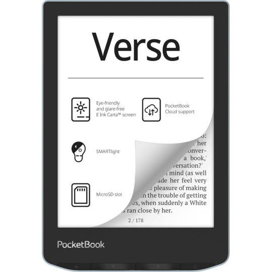 PocketBook Verse je kompaktné zariadenie, ktoré váži len 182 g a je dokonalou kombináciou mechanických ovládacích tlačidiel a dotykovej obrazovky