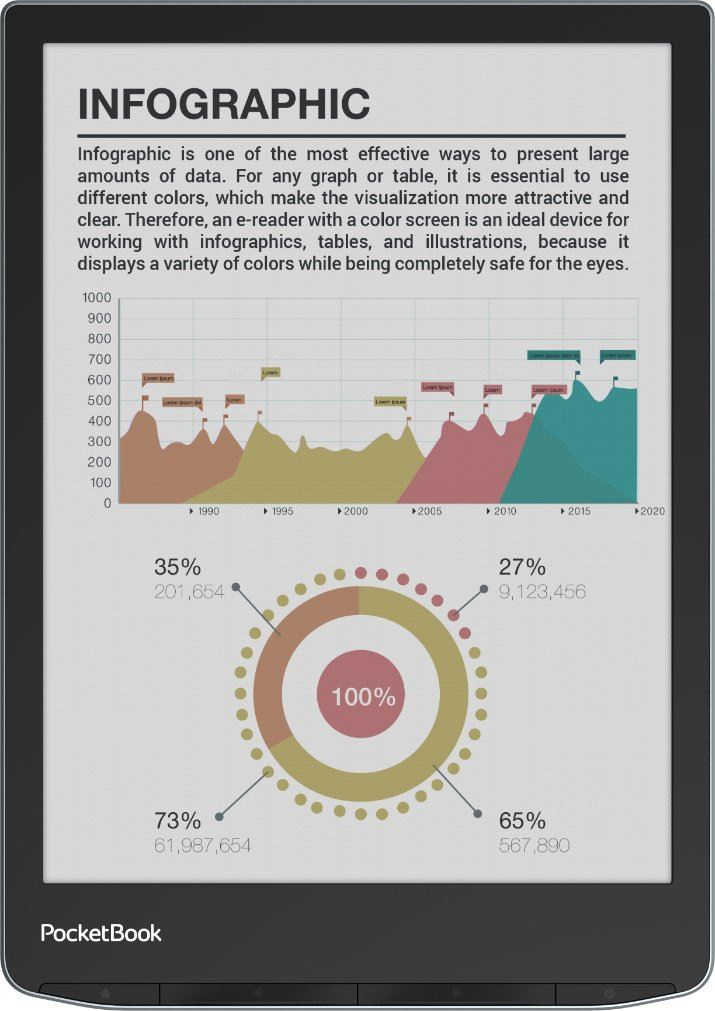 PocketBook InkPad Color 3 podporuje 25 formátov kníh a grafiky bez prevodu vrátane komiksov CBR a CBZ a mangy.