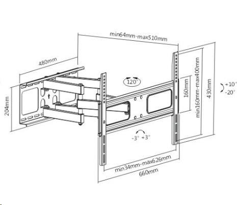 Poctivý nástenný polohovací držiak TV Fiber Mounts Prominent Držiak na TV 37-70", otočný, sklopný, výsuvný, pevná konštrukcia, nosnosť 50kg Nástenný držiak s pevnou konštrukciou na spoľahlivé a bezpečné zavesenie televízorov s uhlopriečkou 37-70". Televízor je po zavesení na tento držiak možné vysúvať od steny, otáčať do strán, nakláňať a v prípade nepresnej inštalácie korigovať rovinu obrazovky. Držiak Fiber Mounts Prominent unesie televízory s hmotnosťou až 50kg a podporuje VESA štandardy 200x200 až 600x400. Farba čierna, záruka 5 rokov. Technické údaje: nosnosť 50kg podpora VESA štandardov pre zavesenie TV 200x200 až 600x400 ideálny pre televízory s uhlopriečkou 37" až 70" výsuvný, nastaviteľná vzdialenosť TV od steny 64mm až 510mm otáčanie televízora do strán +/- 60° možnosť veľkého náklonu televízie dolu až 20°, hore až 10° možnosť korekcie roviny obrazovky kvalitná, robustná konštrukcia bezpečné zavesenie televízorov farba čierna záruka 5 rokov Držiak Fiber Mounts Prominent podporuje VESA štandardy: VESA 200x200 VESA 300x200 a 200x300 VESA 300x300 VESA 400x200 a 200x400 VESA 400x300 a 300x400 VESA 400x400 VESA 600x400