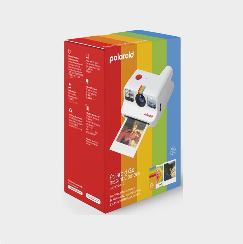 Je opravdu malý (nejmenší fotoaparát na světě), ale má velký tvůrčí potenciál, zrcátko pro selfie, samospoušť, dvojitou expozici a lze jej spárovat s vlastními malinkými barevnými filtry. To vše v klasickém designu a nyní vyrobeném z 30 % z recyklovaných materiálů. Součástí balení je dvojbalení filmů Polaroid Color Go pro 16 barevných instantních fotografií s bílými rámečky.