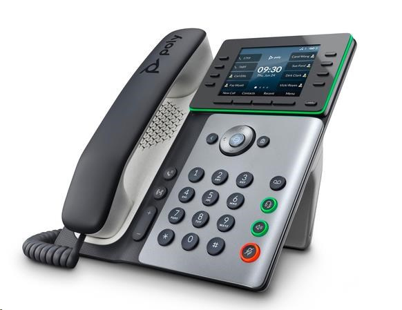 | Audio | Poly HD Voice; Technológia Poly Acoustic Clarity zabezpečuje plne duplexné hovory a potláča akustickú ozvenu aj okolité šumy; Technológia Poly Acoustic Fence potláča okolité hluky pri použití slúchadla alebo káblovej náhlavnej súpravy; Technológia Poly NoiseBlockAI odstraňuje väčšinu okolitého hluku pri používaní konferenčného reproduktora; Aplikácia Poly Computer Audio Connector nainštalovaná v počítači (len Windows) umožňuje vybrať telefón pre zvukový vstup a výstup počítača a použiť s počítačovými aplikáciami slúchadlá, voliteľné náhlavné súpravy a handsfree hlasité odposluchy; Širokopásmový zvuk TIA-920, v súlade s typom 1 (plne duplexný IEEE 1329); Individuálne nastavenie hlasitosti s vizuálnou spätnou väzbou pre každú zvukovú cestu; Detekcia hlasovej aktivity; Komfortné rušenie hluku; Generovanie tónov DTMF (RFC 2833 a v pásme); Prenos zvukových paketov s nízkym oneskorením; Adaptívna pamäť na vyrovnanie oneskorenia |