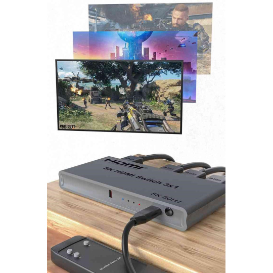 3 HDMI zariadenia na vstupe zdieľajú 1 výstupný monitor, projektor. Výber vstupných zariadení: 1.automaticky, 2.stlačením tlačidla na čele prepínača, 3.diaľkovým ovládačom