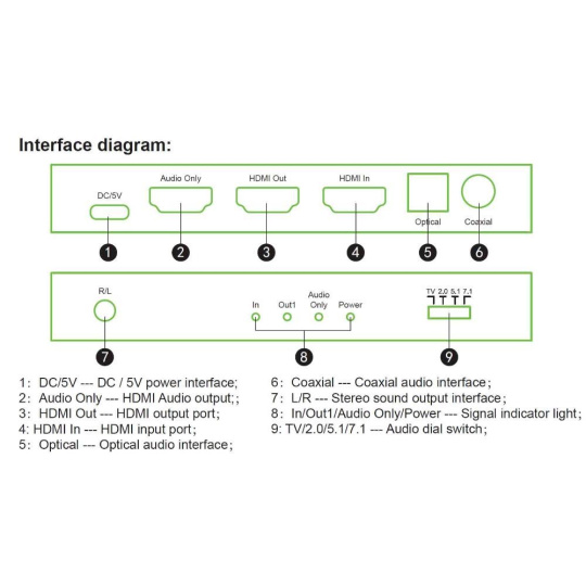 Extraktor umožňuje oddeliť audio signál z HDMI vstupu na analógový alebo digitálny výstup, ktorý je vyvedený na konektory: StereoJack 3,5mm, Digitálne audio RCA CINCH, Digitálny optický TOSLINK (SPDIF) alebo HDMI vyhradený pre audio výstup.