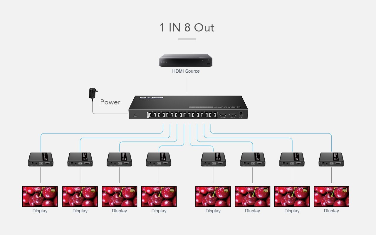 Extender sa skladá z jednej vysielacej jednotky s lokálnym výstupom HDMI a dvoch prijímačov, ktoré sa prepoja káblom CAT6/6a/7 s vysielačom.