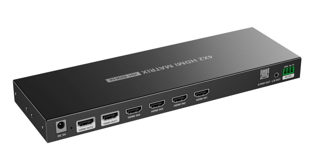 Ovládanie pomocou diaľkového ovládača alebo dvoch tlačidiel na prepínači, je možné nastaviť ľubovoľný vstup na jeden zo dvoch výstupov. Ovládanie pomocou RS232.