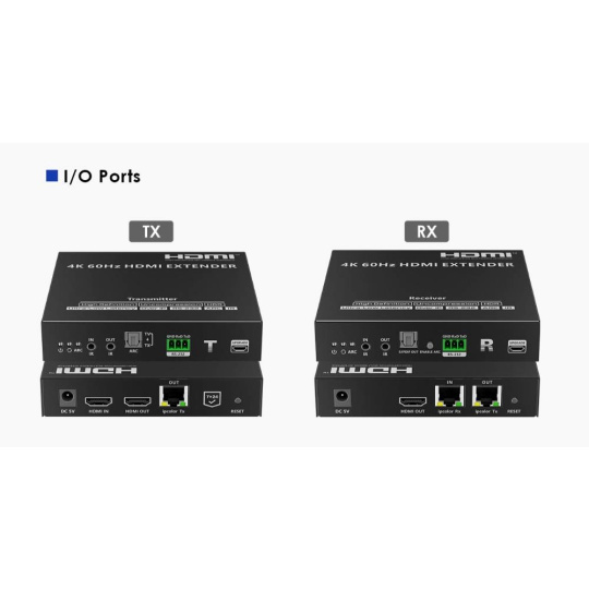 - Podporuje 4K@60Hz 4:4:4 alebo FULL HD 1080p až na 80m pri použití kvalitnej siete Cat6/6A/7