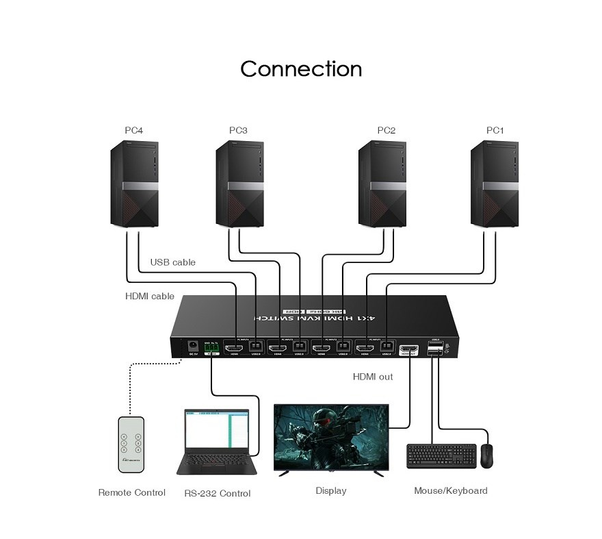 KVM prepínač umožňuje zapojiť až 4 servery alebo PC a ovládať jednoducho pomocou HDMI monitora a USB klávesnice a myši.