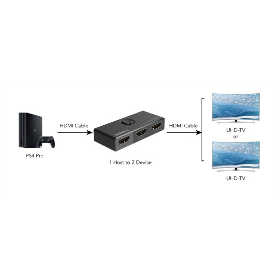 2 HDMI zariadenia zdieľajú 1 HDMI obrazovku alebo prepínač z jedného zdroja HDMI signálu prepína na dva monitory (vždy sa zobrazuje obraz iba na jednom z monitorov). Výber zariadenia je tlačidlo na prepínači.
