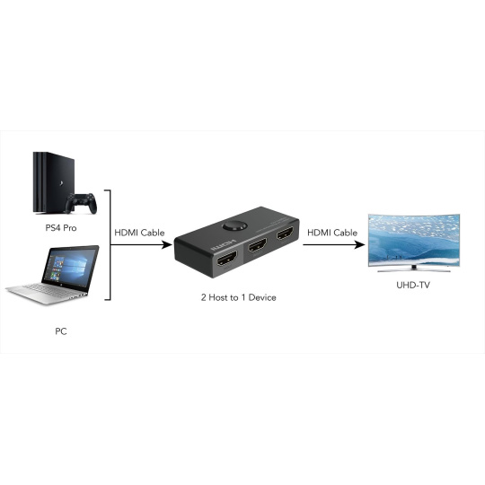 - Prepínač možno pripojiť na dva zdroje HDMI a jeden monitor alebo jeden zdroj HDMI a dva monitory, kde vždy zobrazuje len jeden monitor.