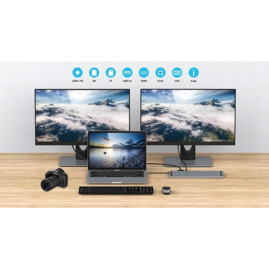 Umožní pridať ďalší monitor a USB perifériu alebo pamäť a súčasne nabíjať cez konektor PD. Umožňuje tiež pracovať na viacerých obrazovkách naraz.