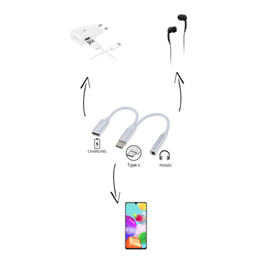 Tento adaptér umožňuje prevod a výstup audio signálu na slúchadlá na konektor jack 3,5mm a súčasne nabíjanie zariadenia s USB typ C konektorom
