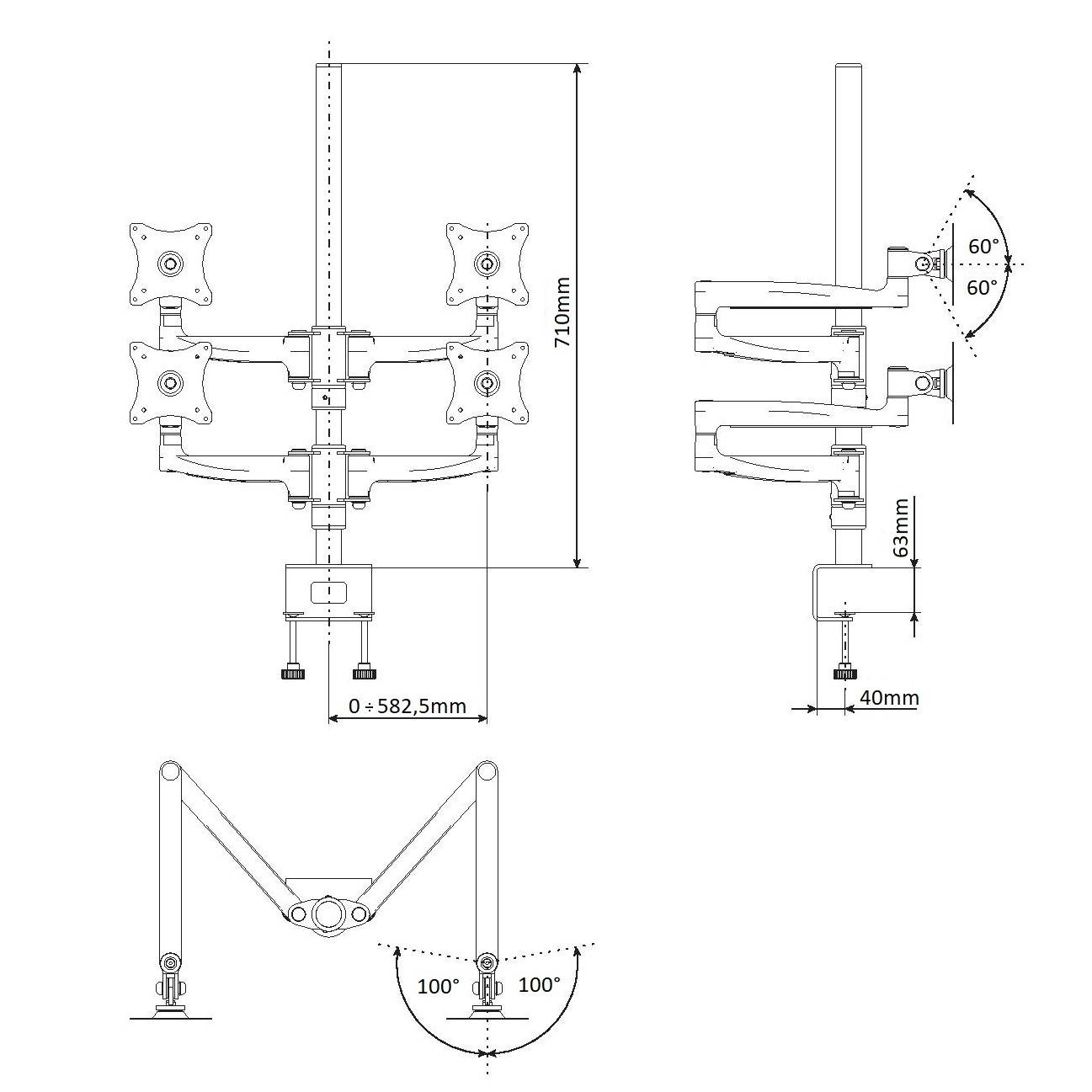 Profesionálny stolný držiak 4 monitorov EDBAK DM141 Profesionálny kancelársky držiak pre náročnejších, plne polohovateľný držiak na 4 monitory 17-29", VESA 75x75 a 100x100, nosnosť 40kg Aj najnáročnejší zákazníci si u nás prídu na svoje - ponúkame Vám špičkový dizajnový držiak na 4 monitory s uhlopriečkou 17-29". Výškové polohovanie, nezávislé dĺžkové nastavenie, otáčanie do strán, náklon. Systém pre vedenie káblov. 2 typy stolového uchytenia - na okraj alebo do priestoru. Farebné prevedenie čierne, záruka 10 rokov. Profesionálny stolný držiak na 4 monitory Edbak DM141 Technické údaje: nosnosť 40kg na monitory 19-29" podpora VESA štandardov 75x75 a 100x100 výškové polohovanie max. 720mm náklon monitoru +/-60° otáčanie do strán +/-90° rotácia monitorov +/-360° nastavenie vzdialenosti monitora od stolového uchytenia systém pre vedenie káblov 2 stolové uchyty - na okraj alebo do priestoru stolovej dosky farebné prevedenie čierne profesionálna kvalita, krásny dizajn záruka 10 rokov Držiaky na 4 monitory EDBAK DM141 podporujú VESA štandardy: VESA 75x75 VESA 100x100