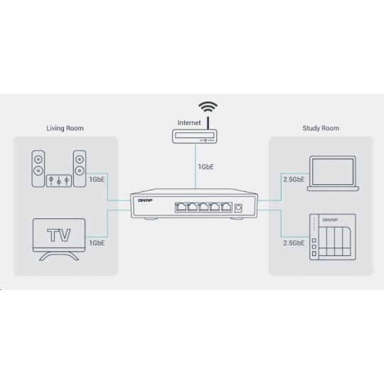 S piatimi portami 2,5GbE switch QNAP QSW-1105-5T okamžite vylepšuje vašu sieť tak, aby mohla využívať výhody zariadení podporujúcich 2,5GbE a NAS, bez nutnosti akýchkoľvek nových sieťových káblov. Zariadenie QSW-1105-5T ponúka takmer tiché prevedenie bez ventilátora a zapojenie typu plug-and-play. Funkcia detekcie a blokovania sieťovej slučky umožňuje jednoduché vytvorenie dostupného vysokorýchlostného sieťového prostredia pre váš domov alebo podnik.