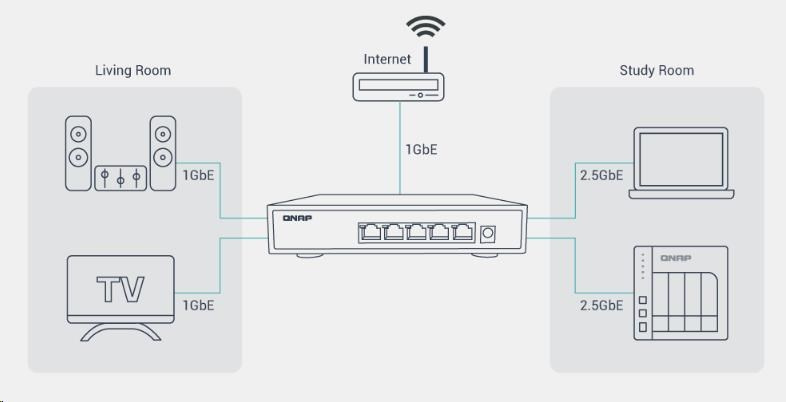 S piatimi portami 2,5GbE switch QNAP QSW-1105-5T okamžite vylepšuje vašu sieť tak, aby mohla využívať výhody zariadení podporujúcich 2,5GbE a NAS, bez nutnosti akýchkoľvek nových sieťových káblov. Zariadenie QSW-1105-5T ponúka takmer tiché prevedenie bez ventilátora a zapojenie typu plug-and-play. Funkcia detekcie a blokovania sieťovej slučky umožňuje jednoduché vytvorenie dostupného vysokorýchlostného sieťového prostredia pre váš domov alebo podnik.