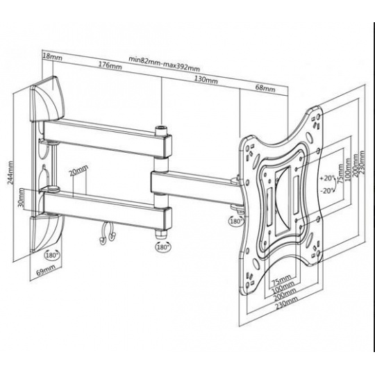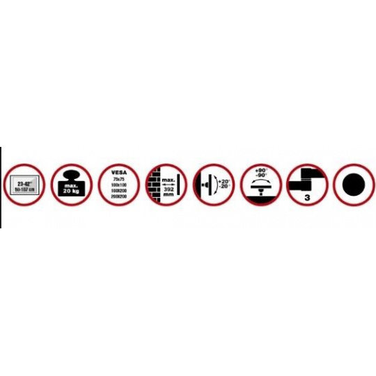 Nástenný držiak pre LCD monitory a televízory s uhlopriečkou 23"- 42" (58-107 cm) a maximálnou hmotnosťou 20 kg. 3x záves, vertikálne výklopný +20°/-20° a horizontálne otočný +90°/-90°, vzdialenosť od steny 82-392 mm, materiál oceľ, farba čierna. Montáž VESA: 75x75, 100x100, 100x200, 200x200...