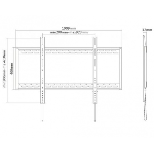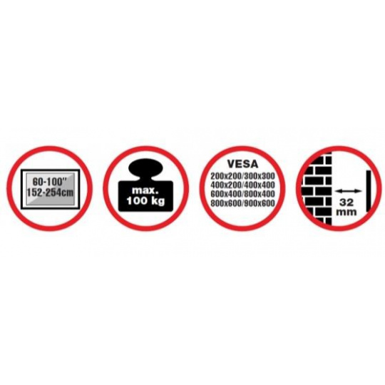 Nástenný oceľový držiak na Plasma a LCD TV s uhlopriečkou 60"- 100" (152-254cm) a hmotnosťou maximálne 100kg. Konzola na zavešenie TV s vodováhou, nie je vertikálne výklopná, vzdialenosť od steny 32mm, materiál oceľ, Click-in systém, farba čierna. Uchytenie VESA: 200x200, 400x200, 300x300, 400x400, 600x400, 800x400, 800x600, 900x600.