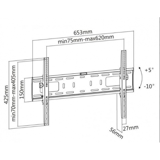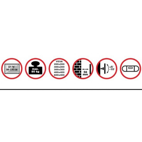 Nástenný oceľový držiak na Plasma a LCD TV s uhlopriečkou 37"- 70" (94-178cm) a hmotnosťou maximálne 50kg. Konzola na zavešenie TV s vodováhou, vertikálne výklopný +5°/-10°, vzdialenosť od steny 56mm, materiál oceľ, cenovo výhodné, farba čierna. Upevnenie VESA: 200x200, 400x200, 300x300, 400x400, 600x400.