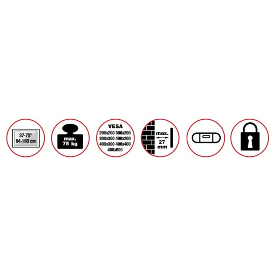 Nástenný oceľový držiak na veľké televízory s uhlopriečkou 37"- 75" (94-190cm) a hmotnosťou maximálne 75kg. Konzola na zavesenie TV s upevnenými držiakmi vertikálne, VESA max 400x600, nie je výklopný, vzdialenosť od steny 27mm, rozmery 44,8x62,5x2,7cm, farba čierna. Uchytenie VESA: 200x200, 300x200, 300x300, 400x200, 400x300, 400x400, 400x600.