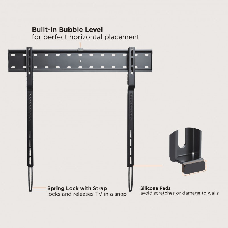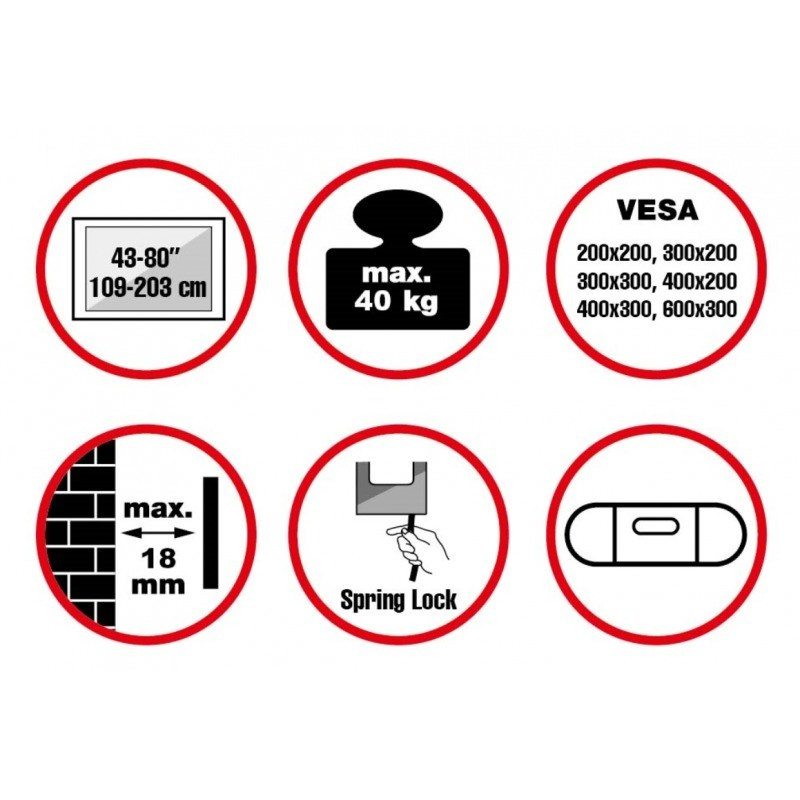 Nástenný oceľový držiak na OLED TV s uhlopriečkou 43"- 80" (109-203cm, rôzna hrúbka) a hmotnosťou maximálne 40kg. Konzola na zavešenie TV s vodováhou, nie je vertikálne výklopná, max. vzdialenosť od steny 18mm, materiál oceľ, zámok Spring Lock s páskou, cenovo výhodné, farba čierna. Uchytenie VESA: 200x200, 400x200, 300x300, 400x200, 400x300, 600x300.
