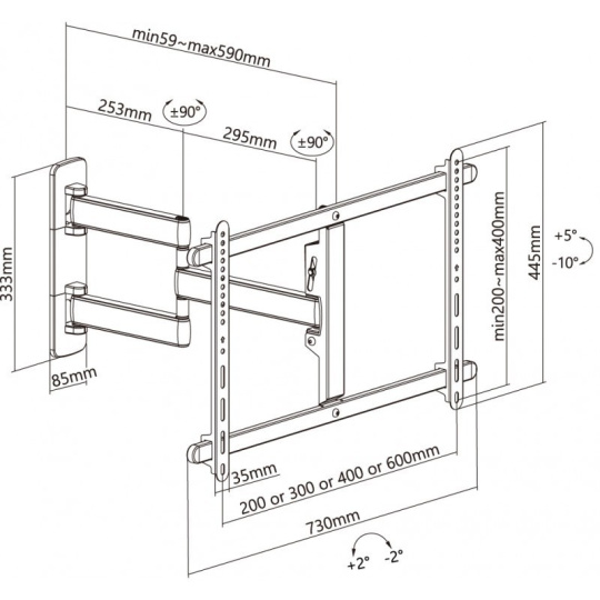 Nástenný oceľový držiak s bočným natáčaním na TV s uhlopriečkou 37"- 80" (109-203cm) a hmotnosťou maximálne 50kg. VESA max 600x400, 3x pant, vertikálne výklopný +5°/-10° a horizontálne otočný +90°/-90°, vzdialenosť od steny 59-590mm, Cable Managment, farba biela. Uchytenie VESA: 200x200, 300x200, 400x200, 300x300, 400x300, 400x400, 600x400. Direction indikátor, jemné nastavenie polohy oproti fixácii na stene +2°/-2°, rozmery 590 x 730 x 445 mm.