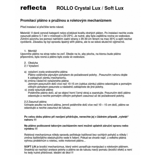 Roletové plátno ROLLO CrystalLine 200x154cm, viditeľná plocha 196x121cm, 16:10, 91"/231cm, biely hranatý kovový tubus 7x215cm/8kg, uchytenie na stenu alebo strop, materiál BetaLux - biela 0,35 tkanina 300g/m2 s 2cm čiernym okrajom a zadnou stranou, Gain=1,0, pozorovacie uhla 120°. Lux - biely matný povrch pre maximálne verný a kontrastný obraz pri aspoň čiastočnom zatemnení. PVC materiál s textilným základom vytvára rovný povrch bez zvlnenia ale v krajoch môže dochádzať k prehnutiu - postupne mizne. Jednoduché uchytenie 4 vrutmi na plastových bočných stranách plátna - stena alebo strop. Možnosť aretácie polohy plátna pri každom otočení mechanizmu. Pozor pri spätnom navíjaní plátna je nutné plátno držať - nesmie dôjsť k rýchlemu navinutiu, ktoré pri náraze na tubus môže poškodiť vnútorný mechanizmus bez možnosti uplatnenia záručnej doby.