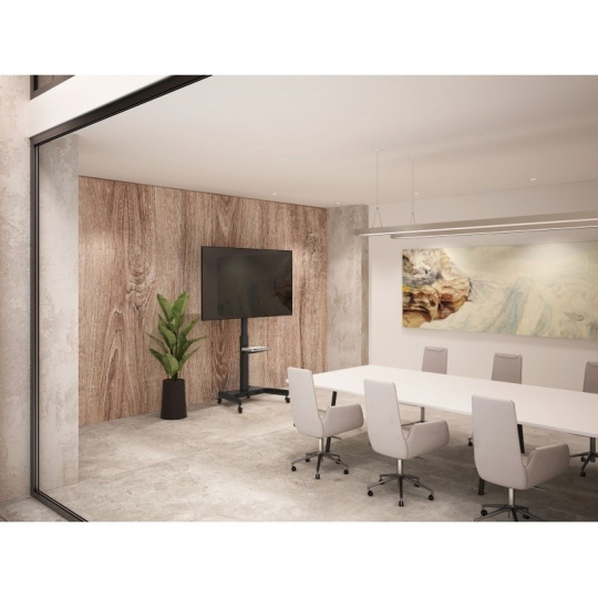 Televízny stolík na veľké TV s uhlopriečkou 32"- 65" (81-165cm) a hmotnosťou maximálne 35kg. Stredový nosný profil 120-160cm na kolieskach s aretáciou, držák vertikálne výklopný +0°/-10°, police 33x43cm max 5kg, Cable managment, rozmery 87x63x142cm, materiál hliník/ocel, farba čierna. Uchytenie VESA: 200x200, 300x200, 300x300, 400x200, 400x400, 600x400.