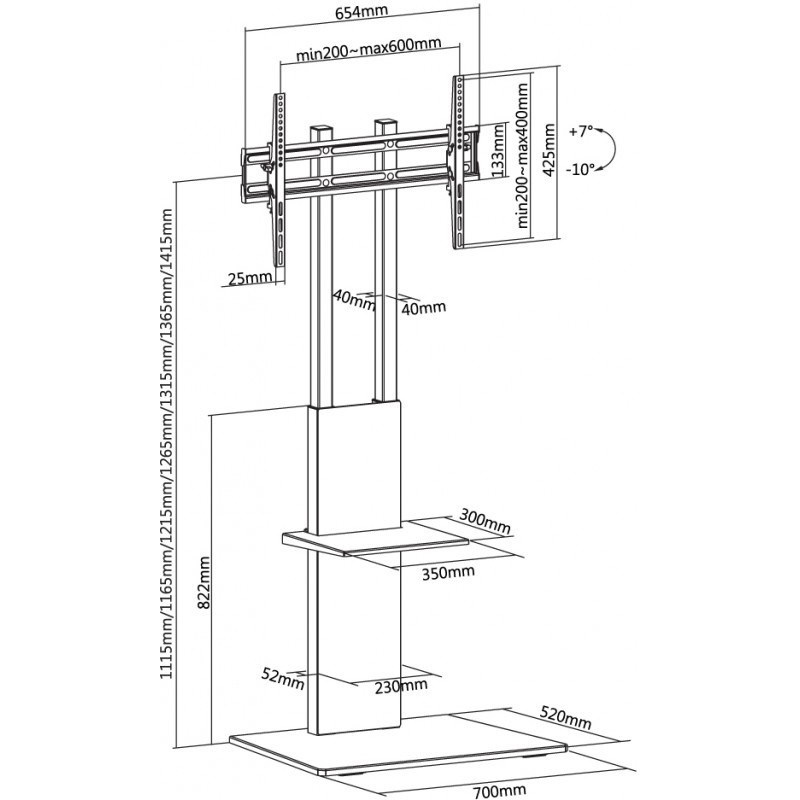 Dizajnový stolík na veľké LCD TV s uhlopriečkou 37"- 70" (94-178cm) a hmotnosťou maximálne 40kg. Stredový nosný profil 111,5-141,5cm na elegantnej základnej doske, držiak výklopný +7°/-10°, polička 30x35cm max. 5kg, oceľová konštrukcia až ku stene, rozmer 70x52x161,8cm, farba čierna. Uchytenie VESA: 200x200, 300x200, 300x300, 400x200, 400x300, 400x400, 600x400.