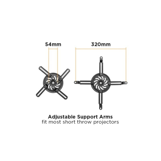 Nástenný držiak na dataprojektory - vzdialenosť od steny 93-152 cm, prístroj je možné otočiť o 360° a nakloniť +/-15°, maximálne zaťaženie 15kg, káblový prechod, čierny. Univerzálny systém upevnenia dataprojektorov (rozsah 5,4-32 cm).