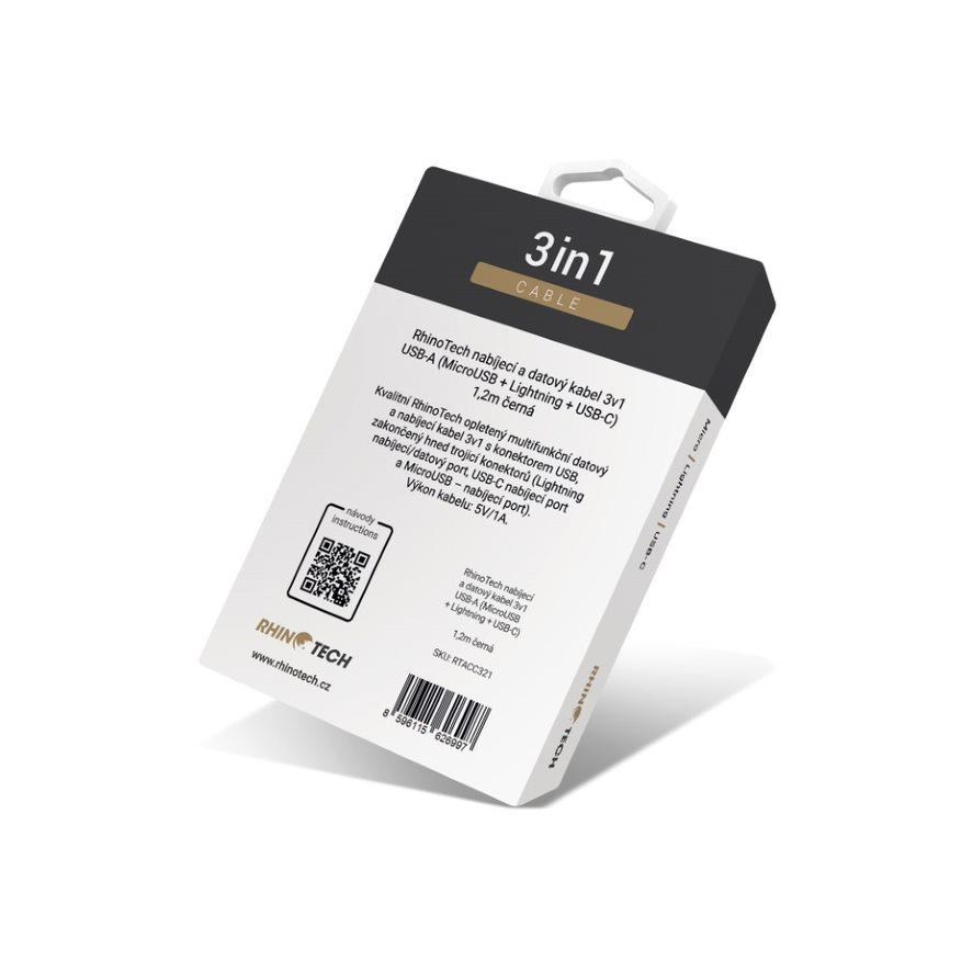 RhinoTech nabíjecí a datový kabel 3v1 USB-A (MicroUSB + Lightning + USB-C) 1,2m, černá